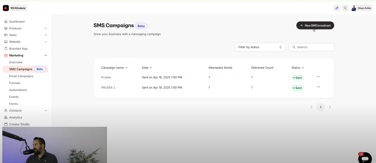 Una vez que hayas integrado tu cuenta de Twilio con Kajabi, haz clic en el botón negro “New SMS Broadcast” que verás en la esquina superior de la pantalla para empezar a configurar tu primera campaña de mensajes.
