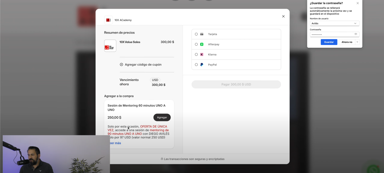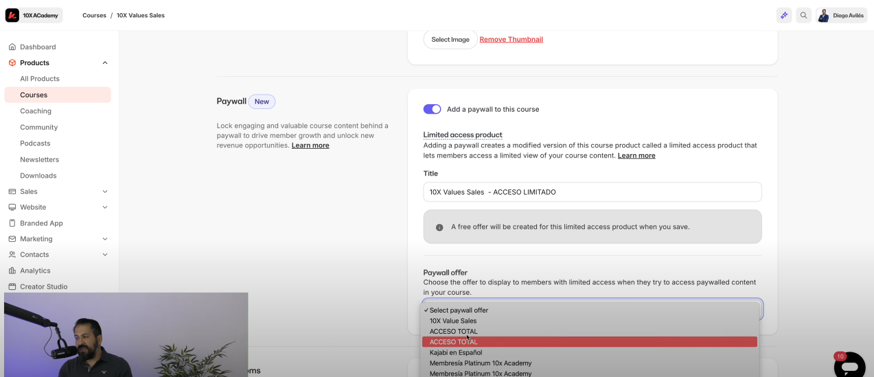 - Selecciona la oferta que deberán pagar tus alumnos para ver el curso completo (ej: la oferta "10x Values Sells").